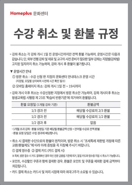 2) 수강료는 현금, 신용카드, 홈플러스 상품권 등으로 납부하실 수 있습니다. (수업 교재비 및 재료비 별도) 단, 인터넷 수강신청은 신용카드로만 가능합니다.