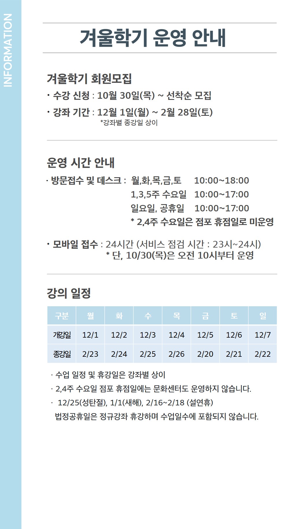 컨텐츠 커뮤니티 소식, 공지 추천 테마강좌 수강후기 온라인이벤트 소식, 공지 25겨울학기 회원모집 안내 오창점 2025-10-27 이전글 [오창점] 25겨울학기 수강혜택 다음글 [안산고잔점] 안산고잔점 25년 겨울학기 회원모집 안내 목록
