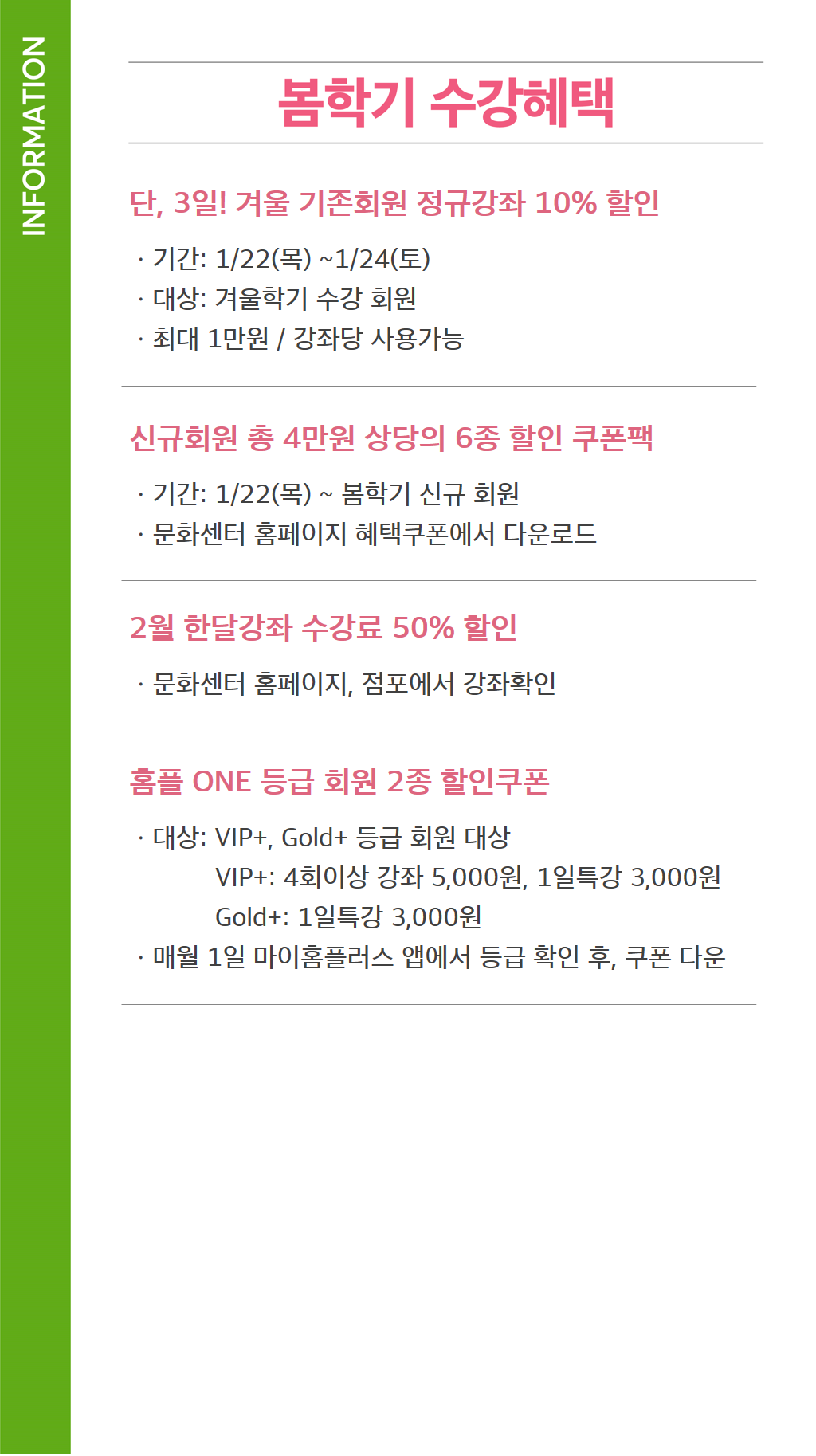 컨텐츠 커뮤니티 소식, 공지 추천 테마강좌 수강후기 온라인이벤트 소식, 공지 봄학기 수강혜택 안내 오창점 2026-01-20 이전글 [오창점] 취소 환불 규정 안내 다음글 [오창점] 봄학기 회원모집 안내 목록